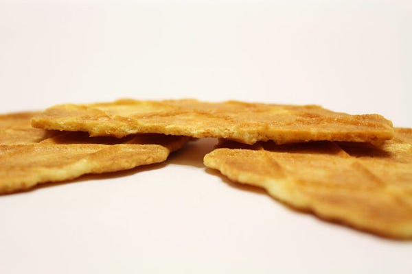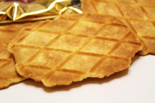 在還沒開之前,其實我一直以為叫鬆餅,裡面應該是厚厚軟軟,長的像派那樣的感覺,但是一摸是硬的,有點意外!打開小包裝後看到裡面有三片,就覺得 ok 不錯!有誠意。一片的大小大概一個手掌大,外觀是比利時鬆餅類的 (waffle),但格子沒那麼深,不能故意把楓糖醬裝滿格子!可惡