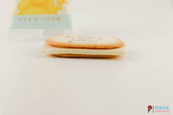 一打開來就有非常濃郁的香蕉味道且非常的甜,有點偏香精味,外層餅乾比淡淡的奶香味,夾心則是濃郁的香蕉味,吃起來沒有聞起來的甜,還夾帶一點奶香及優格的香味,吃起來就像 TOKYO BANANA 的香蕉蛋糕餅乾版,若你是東京芭娜娜的愛好者,你一定會喜歡這個味道喔!