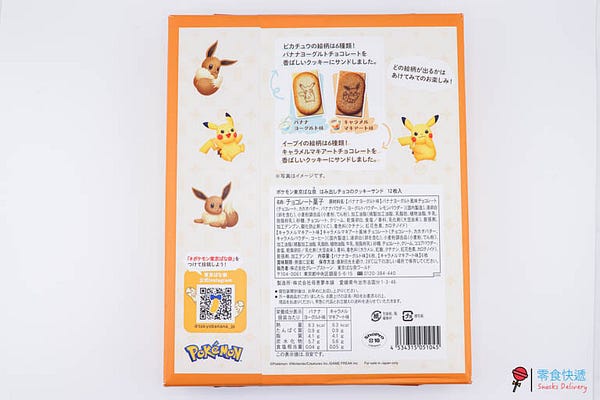 從外包裝就可以看到大大的皮卡丘和伊步,總共分有兩種口味:皮卡丘是香蕉優格口味,伊步則是為焦糖瑪奇朵,他總共推出 12 入和 24 入兩種包裝,而這次主要是介紹 12 入的包裝,所以口味分別為各 6 片,包裝大小約 21 cm x 17 cm x 2.7 cm,完全不會佔太多行李箱的空間。
